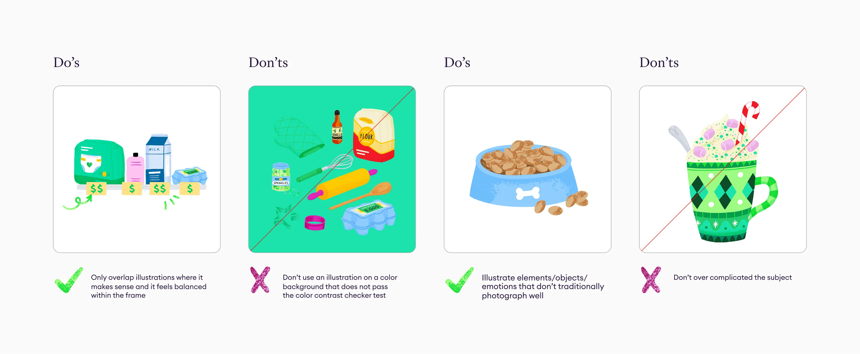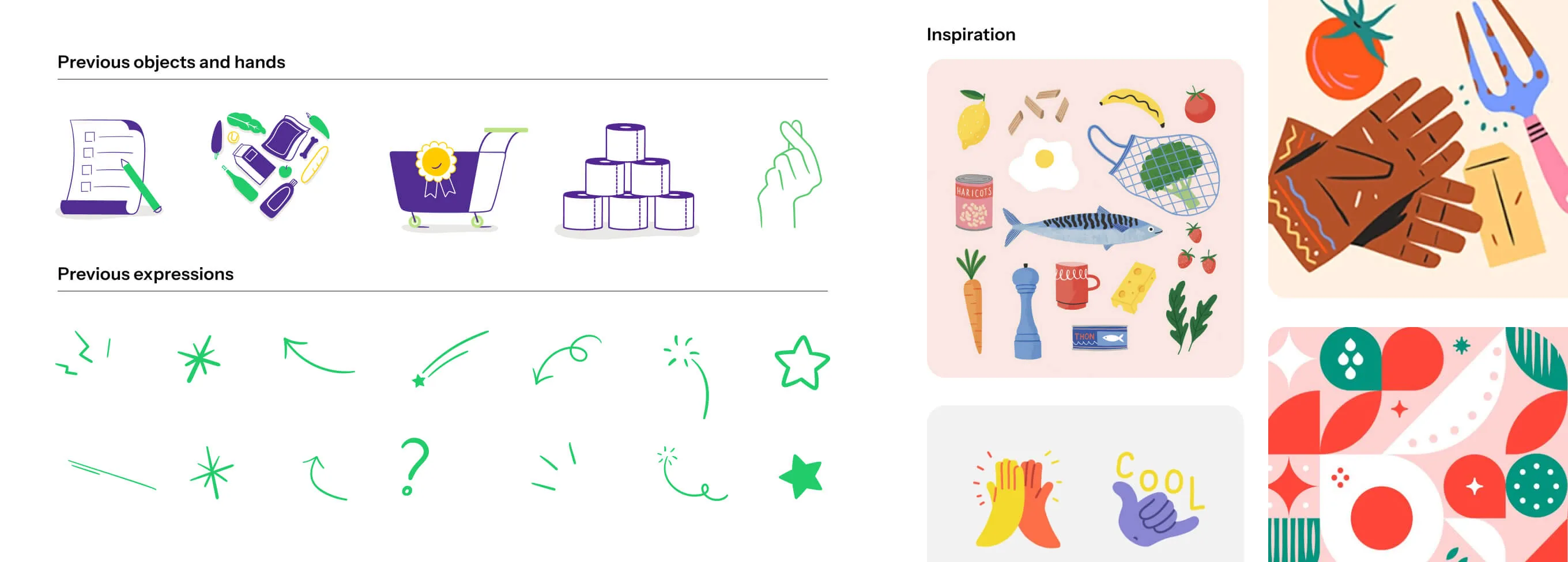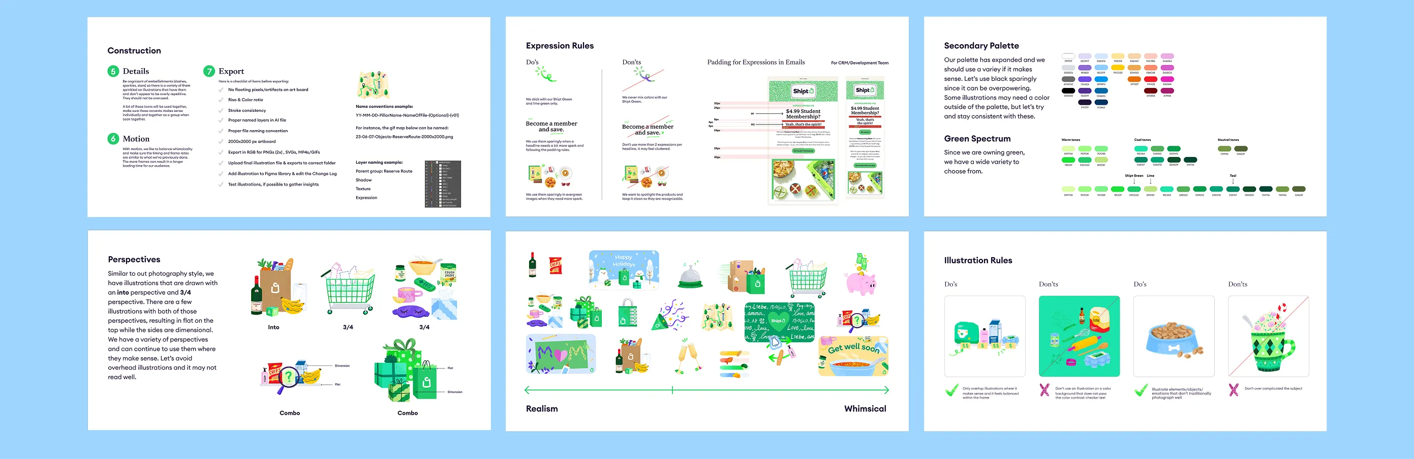 Shipt was refreshing its visual identity, and I led the art direction for the new illustration style. I created new illustration assets, built a library with guidelines, and partnered with cross-functional teams and an external illustrator to bring the vision to life.