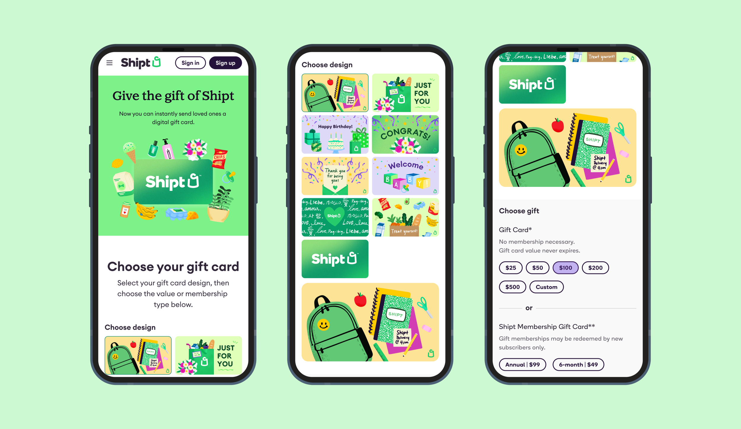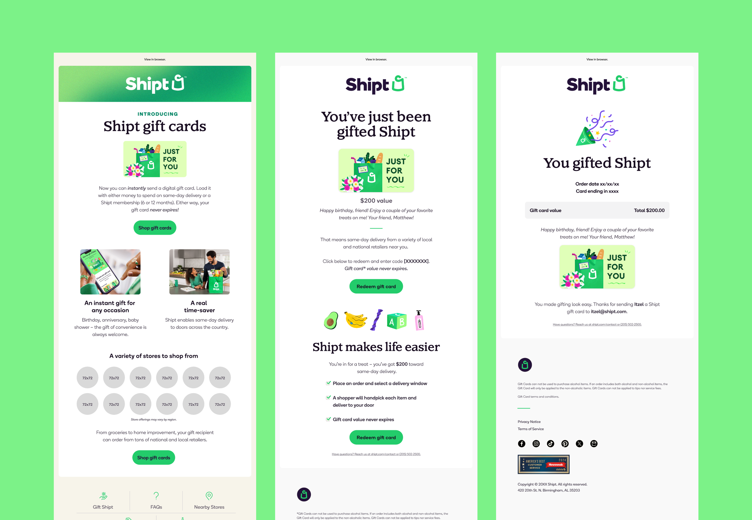 Shipt is launching digital gift cards and customers are able to purchase them with personalized designs and custom value that can be used toward market place orders. The main focus is to create excitement around sending a personalized digital gift card with Shipt credit and memberships while motivating our audience to buy gift cards as gifts. The key performance indicator would be the number of gift cards and memberships purchased as well as acquiring new members.