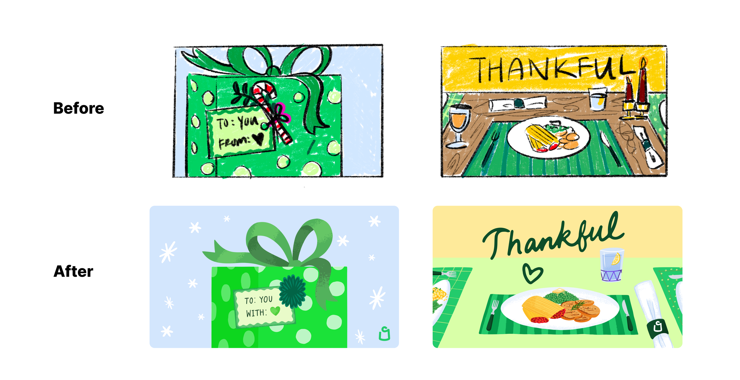 I started with brainstorming a list of items I associate with each and considered our Shipt spark, bringing an extra twinkle to them. I sketched out my ideas on Procreate and layered them with risograph texture before vectorizing them on Illustrator. We had a new suite of holiday illustrations created for us and I repurposed them to work hard on hitting on these moments along with creating my own. It was also important to illustrate accurately, for example not including alcohol in the designs since customers cannot purchase alcohol with Shipt credits. My other intention was to keep our Shipt logo always visible whether that was on the bottom right corner or somewhere naturally where it’d make sense. My designs lived on landing pages, emails, in-app, and social media.